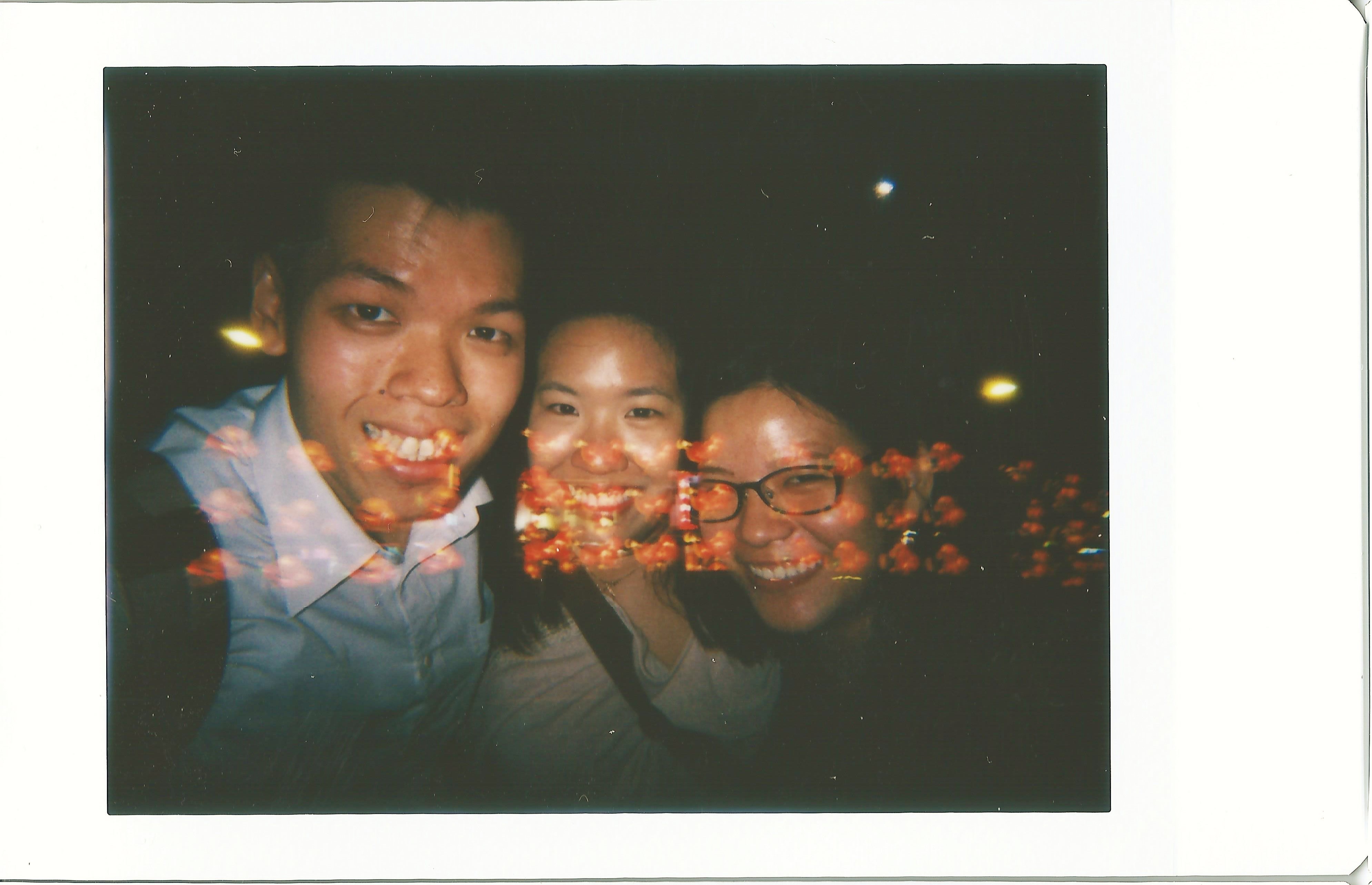 Multiple exposure: Background taken on the Chinatown bridge, against the backdrop of some beautifully lit shophouses. We LOVE this shot because the lights bring out the festive mood. Our faces could also be seen (YAY)! From L-R: SK, Sandra, Damian