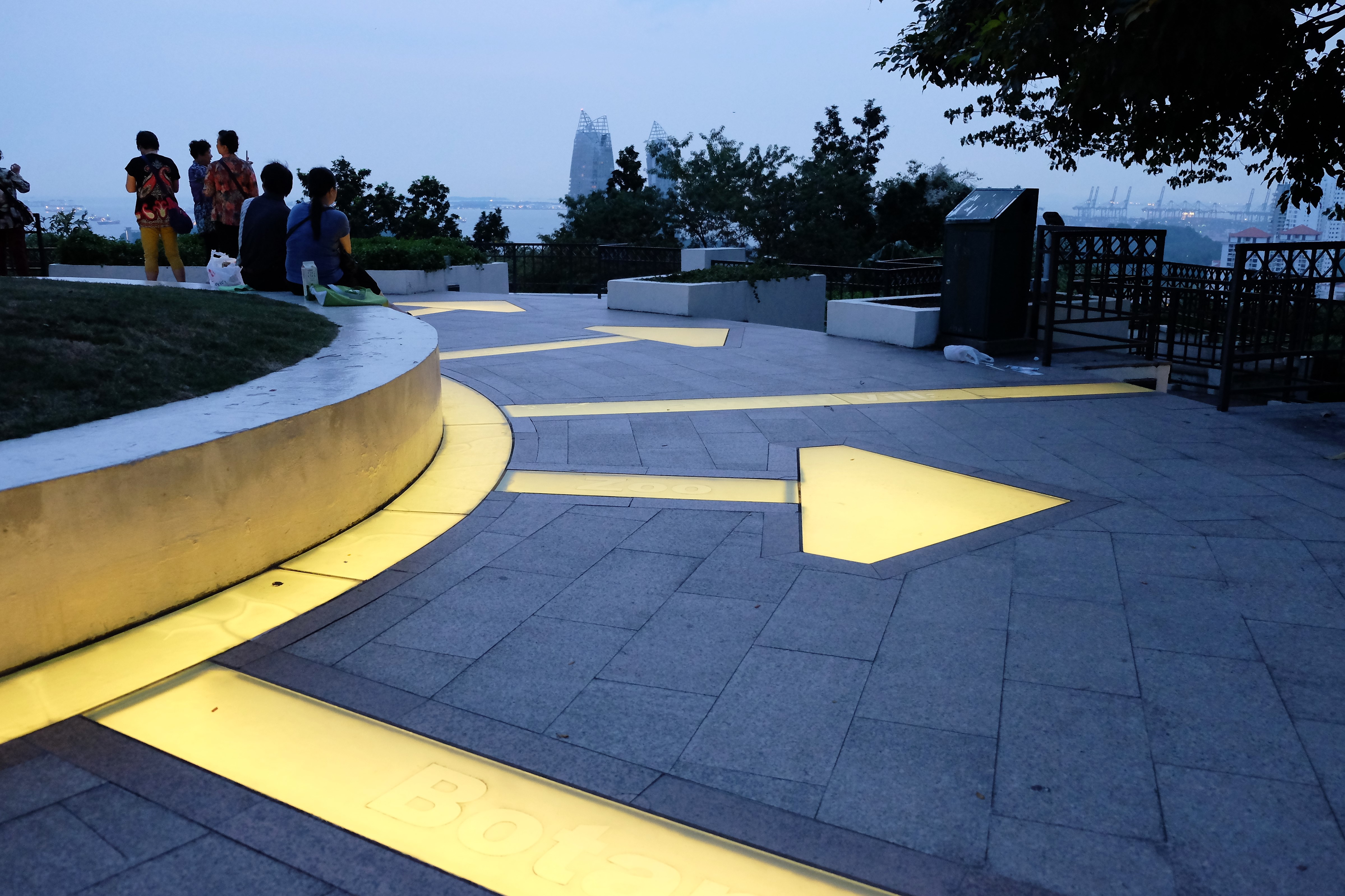 Someone’s all contemplative hmm.Mount Faber is connected to Sentosa Island via cable car (unfortunately a mode of transportation not enjoyed by many these days).Coloruful stairway that leads to the cable car station!😀 – #touristsinourowncountryWe took a winding path around Mount Faber and saw the Danish Seamen’s Church!Oh look, a bell!Instead of walking towards Henderson Waves, we took a detour towards the Merlion and Murals. We stumbled upon the magnificent view of Telok Blangah Estate and the Central Business District.Here are some murals which tells the story of Singapore’s past, present, and the future!At the highest point of Mount Faber, one can see these lighted arrows that point towards different places in Singapore (eg: Botanical Gardens) and the SEA regions (eg: Bangkok). We thought it was really cool (& so was the weather by 7pm haha). We also like how the arrows are lit up at night!Tourists sure know how to pose with our belovevd baby Merlion!Beautiful night view from Mount Faber of the CBD area and the housing estates!