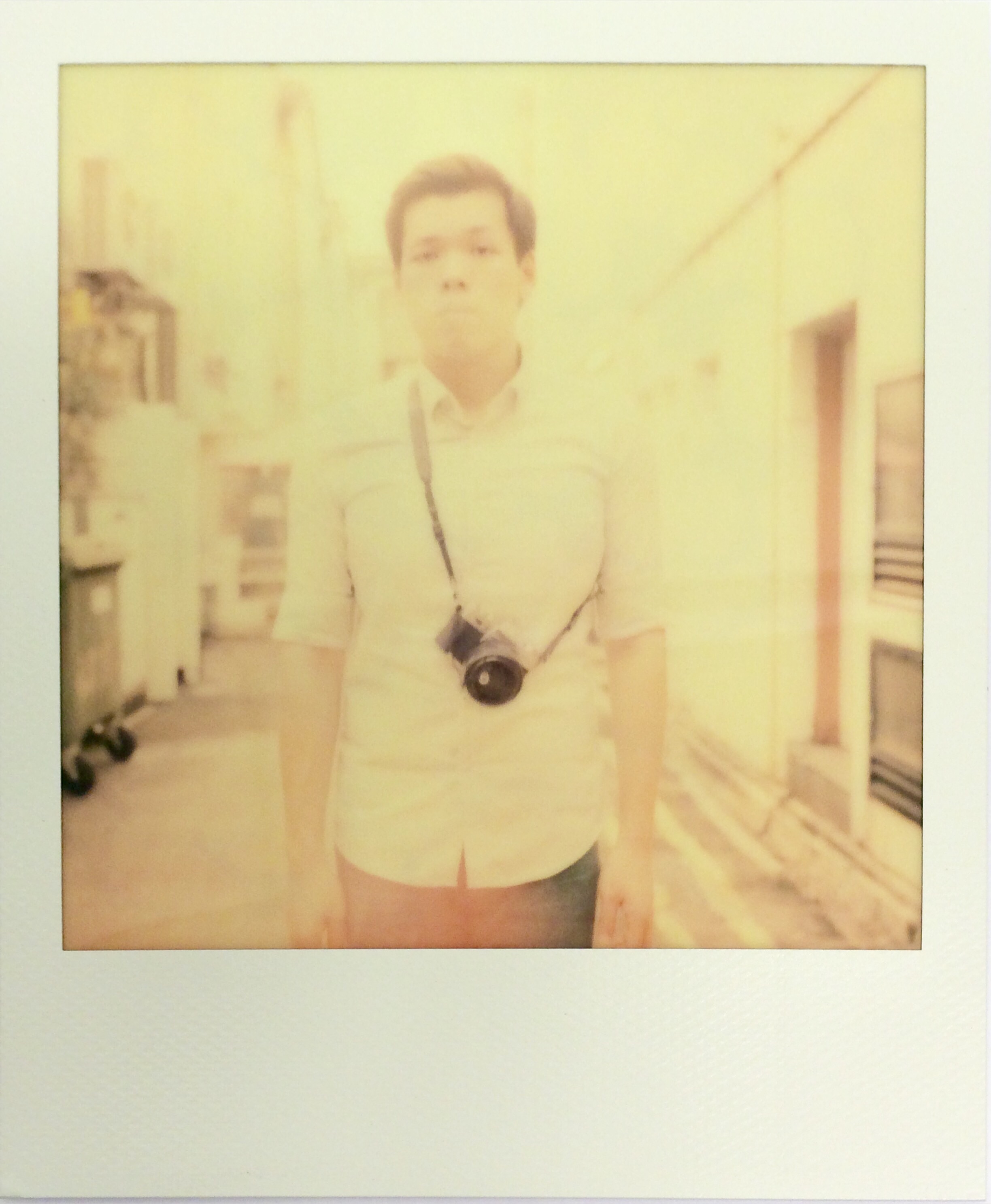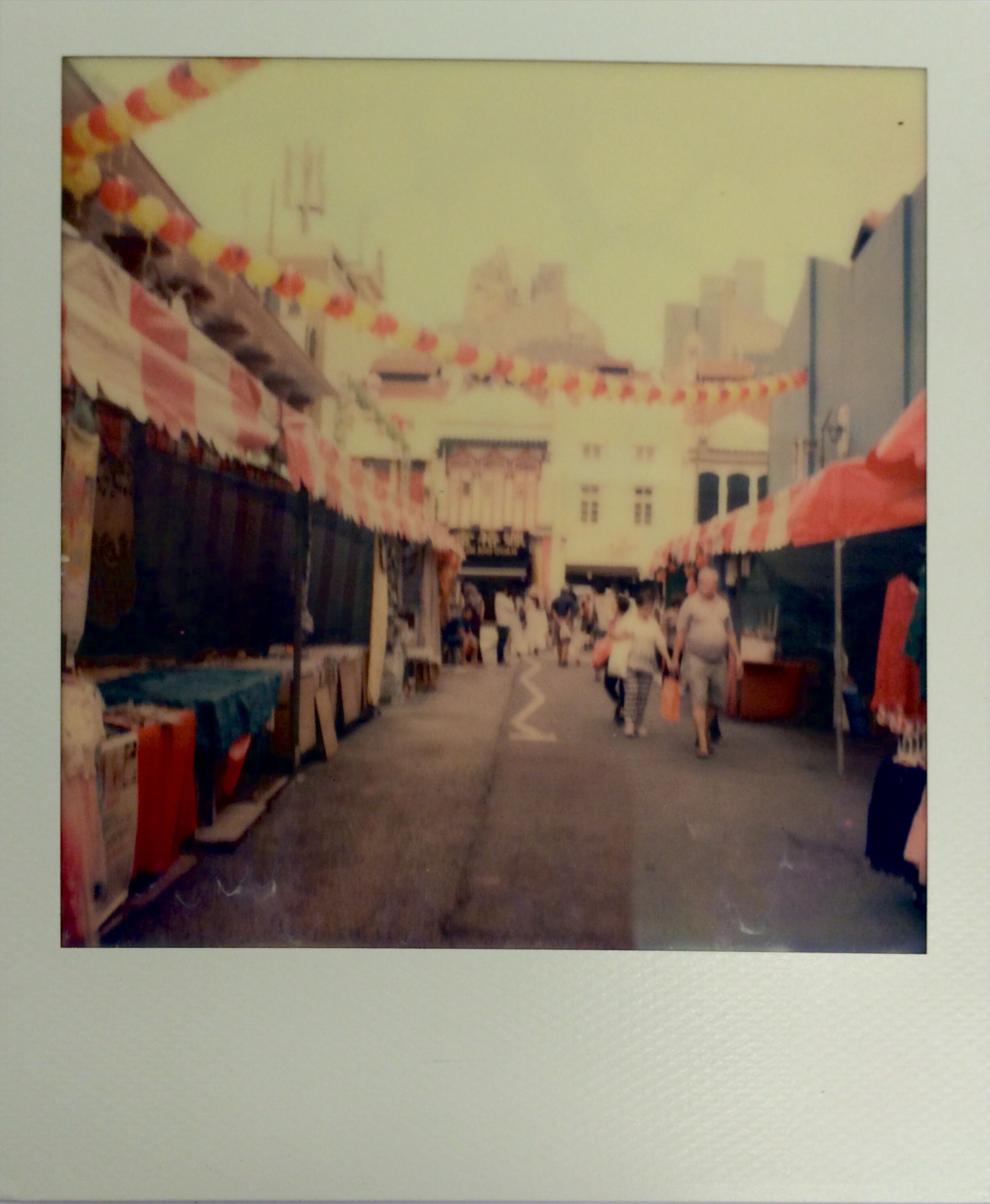 This was our first Polaroid taken with the Sonar SX-70; the venue was Chinatown, where shops were set up for the usual Chinese New Year commotion. We observed that the film turned slightly yellow, possibly due to overexposure and humidity (we were not able to protect the film when it came out from the camera).A snapshot of Sandra outside Chinatown’s food street. We learnt that the camera is very sensitive to movements; without the use of a tripod, the Polaroid turned out blurry. The effects of humidity and overexposure resulted in the yellowish tint. After this, we decided to place our Sonar SX-70 on a tripod!A Polaroid of Damian along one of Chinatown’s famed alleys. This photo was taken on a tripod, so we were more confident to play with the manual focus. We figured the photo was overexposed due to our mistaken belief that the evening would require more light (a lesson learnt, it seems). We should mention the yellowish tint seems to be an unfortunate given in our local climate conditions
