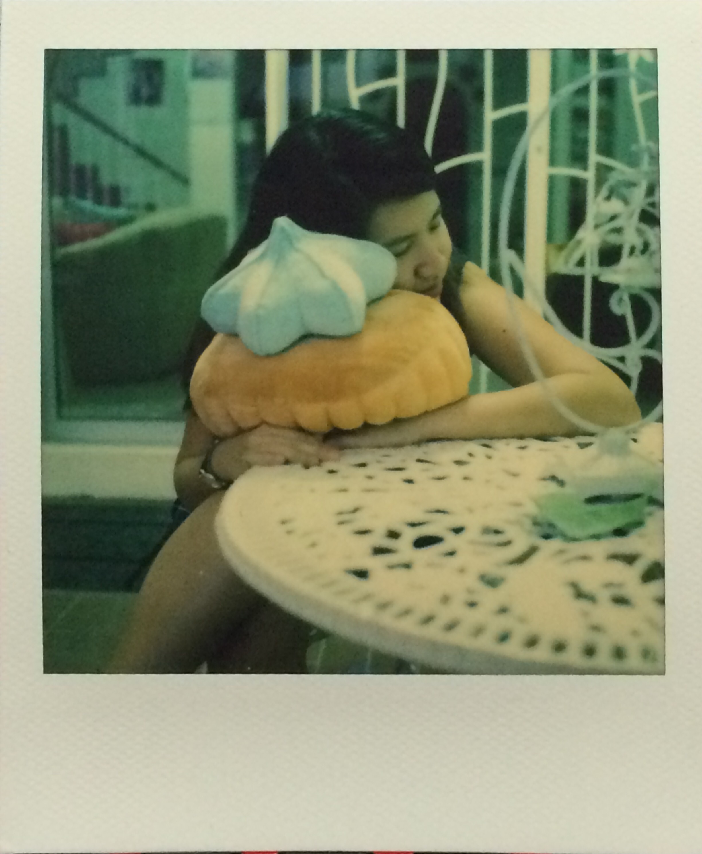 This manually-focused shot of a flower petal was taken outdoors near Sandra’s workplace. The film was subsequently developed indoors in an air-conditioned environment, which could account for its lack of yellowish tint and even aid the development of film. The camera was placed on a bench, and thus the image was not shaky.One of our favourite photos, this Polaroid of a flower facing the window was taken indoors. Like the above film, it was developed indoors. The camera was placed on the table and focused manually, thus the clear image.This Polaroid was taken outdoors and subsequently developed indoors in the same environment as above. As it was taken during a bright and sunny day, the image was not as overexposed.Damian’s favourite photo of Sandra with her favourite ice gem cushion! Here, a tripod is used to stabilise the camera, and without a frog tongue, we had to take precautions to ensure the film did not get too overexposed. It was not as yellowish as the other photos.