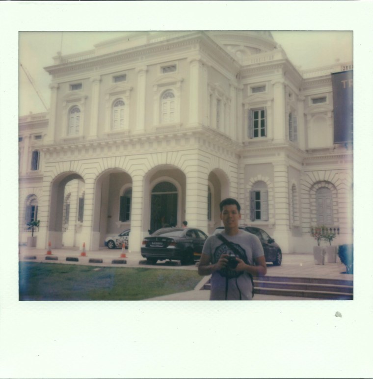 Damian posing outside the National Museum! The first thing you would have noticed is that it is not the square-format of most Polaroids; in fact, this measures 4.0″ x 4.1″, and clearly landscape shots will look much better!Capturing the dome of the National Museum; we were also impressed that given the low lighting, the Polaroid Spectra captured the dome quite well (although it was not very symmetrical heh).Flowers taken outside the National Museum; here, we were testing the manual focus of the Polaroid Spectra, ended up not focusing on the flowers but on the road (we will figure it out as we take more shots!)